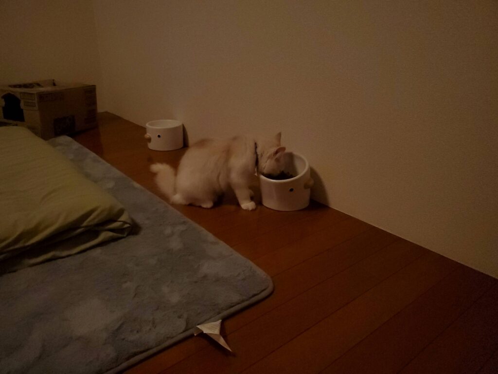 帰宅してみると、彼女はまったく食事をしていなかった。どうしたんだろう。美味しくなかったのか。レシピを間違えたのか。食べたくないの。僕が声をかけても素知らぬ顔。理由を教えてよ。怒ってるの。彼女は僕から離れていく。機嫌、わるいのかなぁ。すこし遊ぶ、どう。遊んでいる彼女は元気に飛び跳ねて、ときたま僕にじゃれたりもする。ごろごろごろごろ。二人で一緒に寝転んでみる。ごろごろごろごろ。僕もわりと楽しい。夕飯つくるね。朝と一緒のメニュー。朝、水、多かったのかなぁ。夜はレンジで少し温めてみたりする。はい、どうぞ。あれ、わりとよく食べる。遊んだからなの。彼女が食べながら振り向いた。独りでたべるの、つまらないかぁ。そうだよねぇ。ごめんね、これからは一緒にたべるよ。