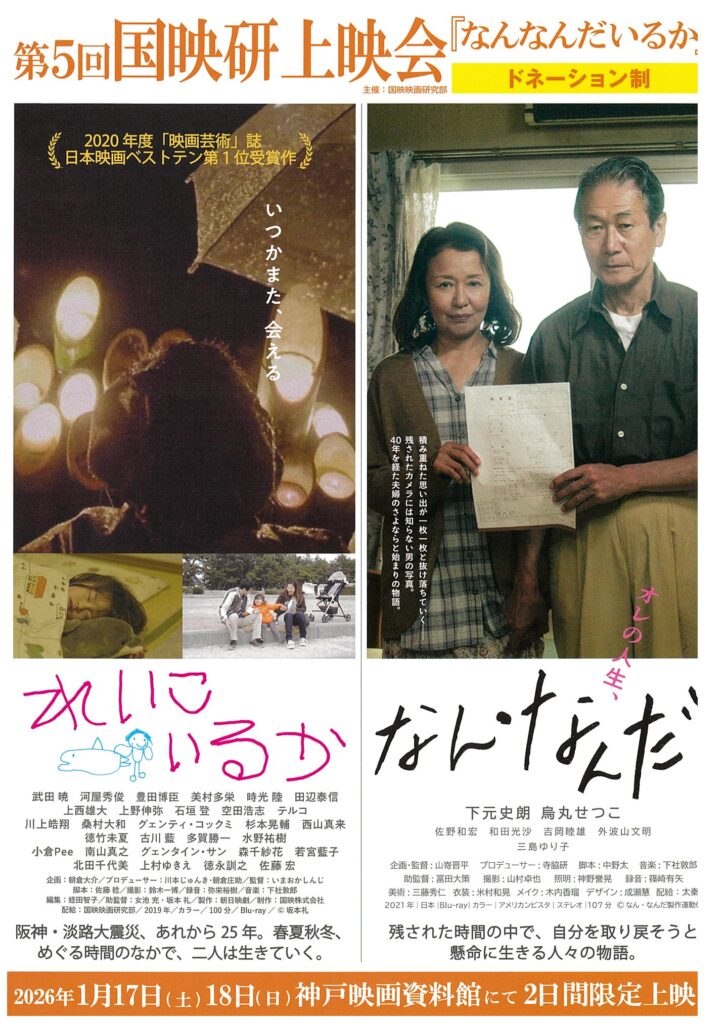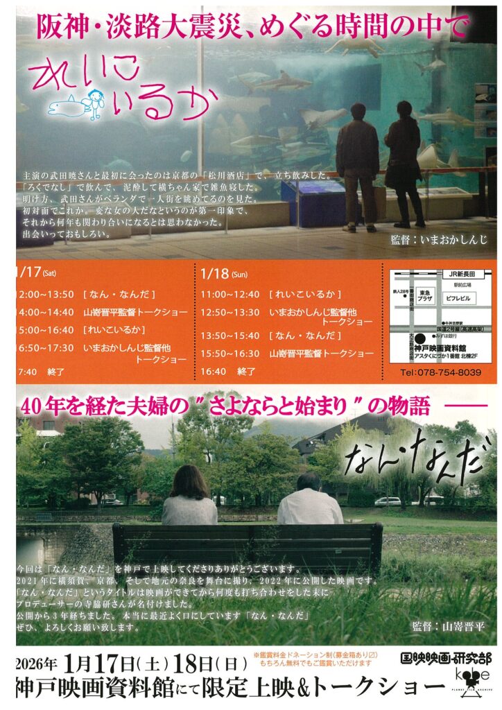 毎年1月17日に神戸映画資料館で開催している『れいこいるか』の定期上映会、今年は山嵜晋平監督作品『なん・なんだ』とのカップリングになります。上映は17(土)と18(日)の二日間、料金はドネーション制ですのであなたのお気持ち次第、もちろん無料でもご鑑賞できます!両日ともいまおかさん、山嵜くんが劇場にお邪魔しますので、是非ふたりに会いに神戸にいらっしゃってください!
